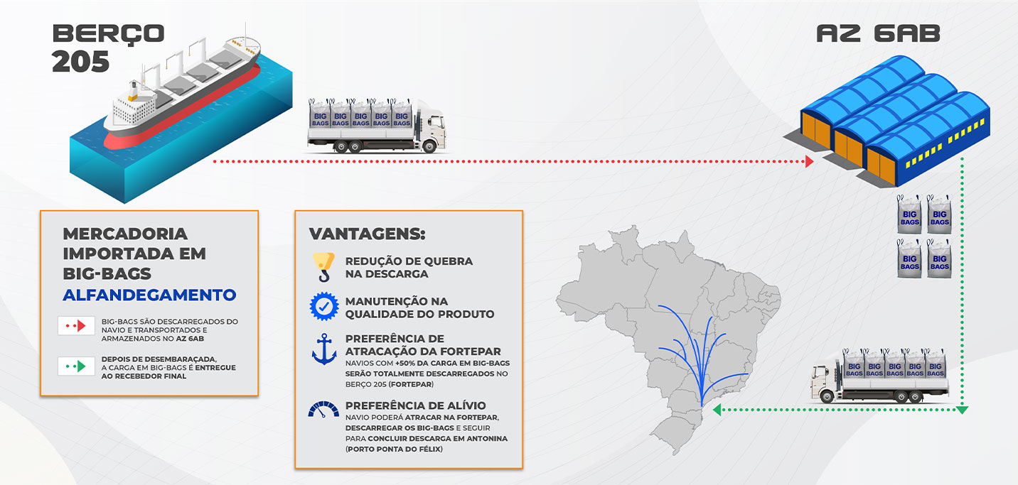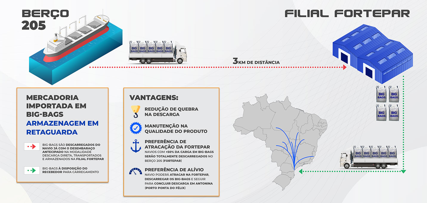 Nossas principais atividades são recepção rodoviária, armazenagem e expedição aquaviária. A Fortepar realiza operações de importação e exportação de carga geral, caixaria, big bags e ensacados, como açúcar e fubá, de longo curso ou cabotagem.